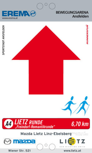 "Freindorf-Romantikrunde" In traumhafter Naturlandschaft mit abwechslungsreicher Streckenführung verläuft die rote Lietz Runde. Ab km 1,5 auf Naturboden der Au entlang bis Freindorf, weiter über die Traunuferstraße und Unter-Audorf. Geeignet für konditionsstarke und geübte Läufer bzw. Walker, jedoch mit geringerem Tempo auch für alle zu schaffen.