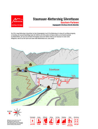 Umgeben von den höchsten Bergen Vorarlbergs liegt der Klettersteig an der Staumauer des Silvrettasees in wunderschöner Kulisse. Die Schwierigkeit des Klettersteigs befindet sich im A/B Bereich und ist somit bestens für Einsteiger geeignet. Die gesamte Länge des Klettersteigs beträgt ca. 300 m und ist mit Highlights wie zum Beispiel Sitzbänken, Seilbrücken und sogar einem Seilpendel von 12 m, welches allerdings auch umgangen werden kann, gespickt. Nach dem Ausstieg über das Ausstiegspodest auf die Staumauer, kehrst Du zurück über die Staumauer zum Ausgangspunkt.