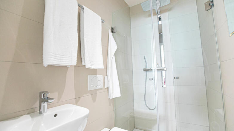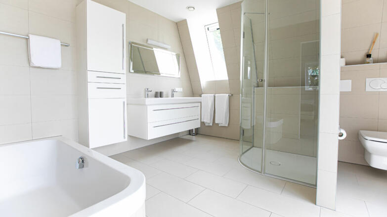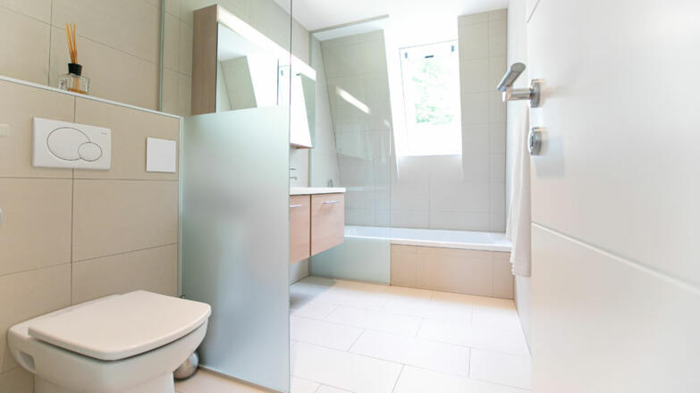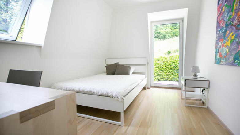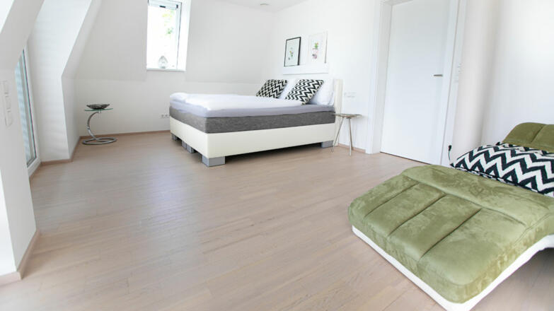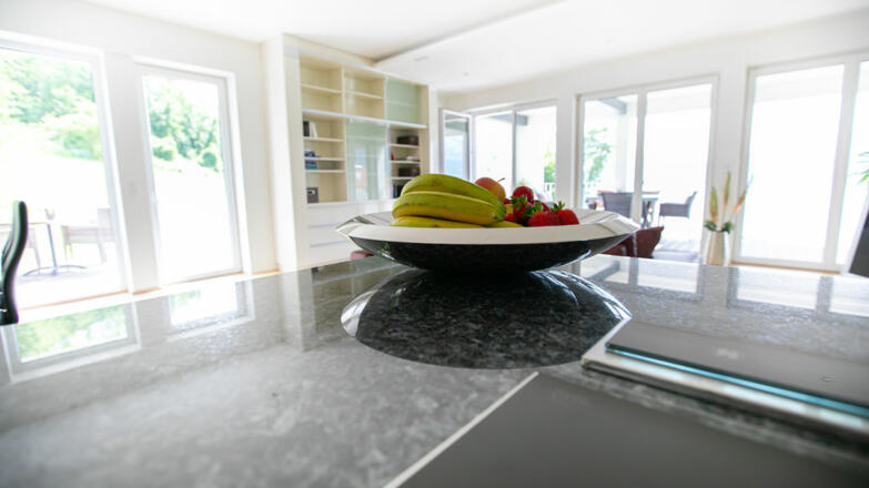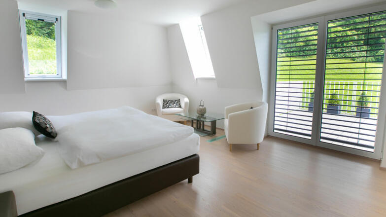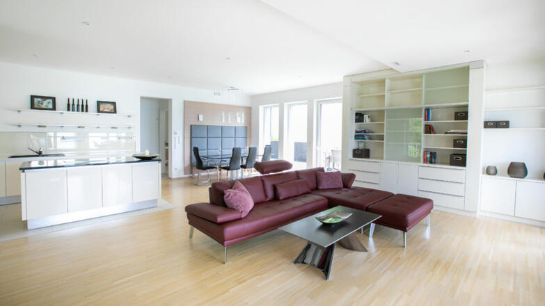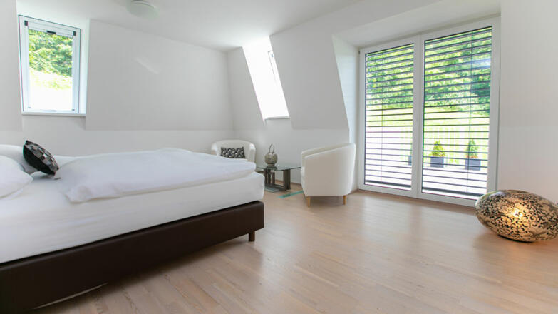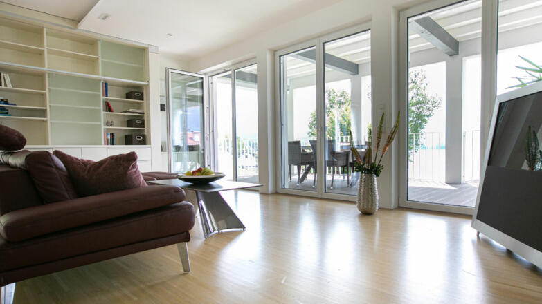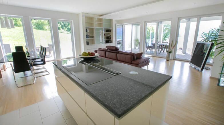 Die Villa ist großzügig mit hochwertigen Materialien ausgeführt. Gediegene Parkettböden in allen Zimmern, erlesener Stein in den Sanitärbereichen, luxuriöses doch schlichtes Design und bodenebene dreifachverglaste Fensterfronten.
