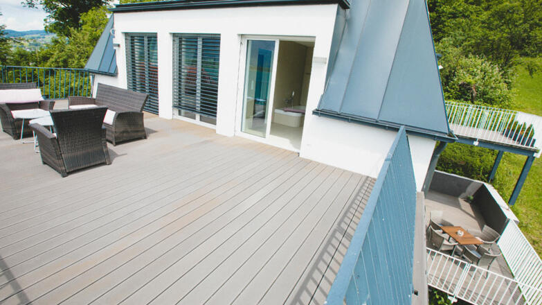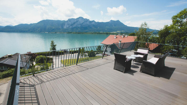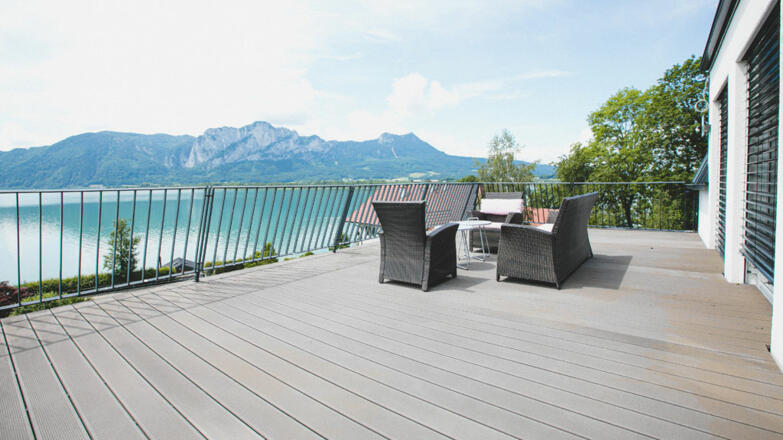 Die moderne Passivvilla besitzt eine Gesamtgrundfläche von rund 1.050 m². Darauf befinden sich sorgfältig durchdacht und perfekt umgesetzt ca. 301 m2 Wohnnutzfläche auf drei Etagen, ca. 150m² Freiluftflächen auf fünf Terrassen, zwei Pkw-Stellplätze in einem geräumigen Carport und ein Außenpool, mit einer UV-Wasseraufbereitungsanlage und über die Abwärme der Raumluft bei Bedarf beheizt. Das Trinkwasser kommt von der naheliegende Privatquelle direkt vom Mondseeberg.